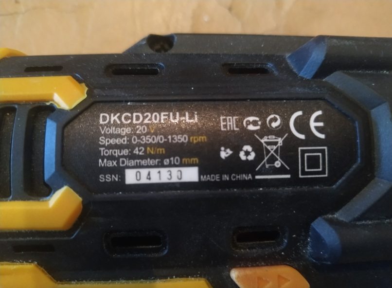 Шильдик с электрическим характеристиками шуруповерта DEKO DKCD20FU.