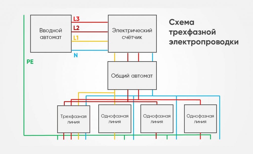 В случае с трехфазной проводкой переменный ток подается уже по трем фазным проводам (L1, L2 и L3), а по нейтральному (N) возвращается. Также присутствует и заземляющий провод (РЕ). При этом между каждой фазой и нулем напряжение составляет 220 В, а 380 В проходит между самими фазами.