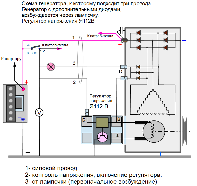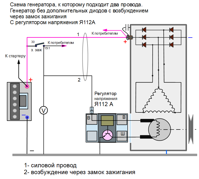 В схеме генератора с регулятором напряжении Я112А, ток возбуждения проходит через замок зажигания. Пустить его, минуя замок зажигания по короткому пути нельзя, надо, чтобы замок зажигания размыкал цепь возбуждения при выключенном двигателе, иначе это приведет к быстрой разрядке аккумулятора через ротор генератора.