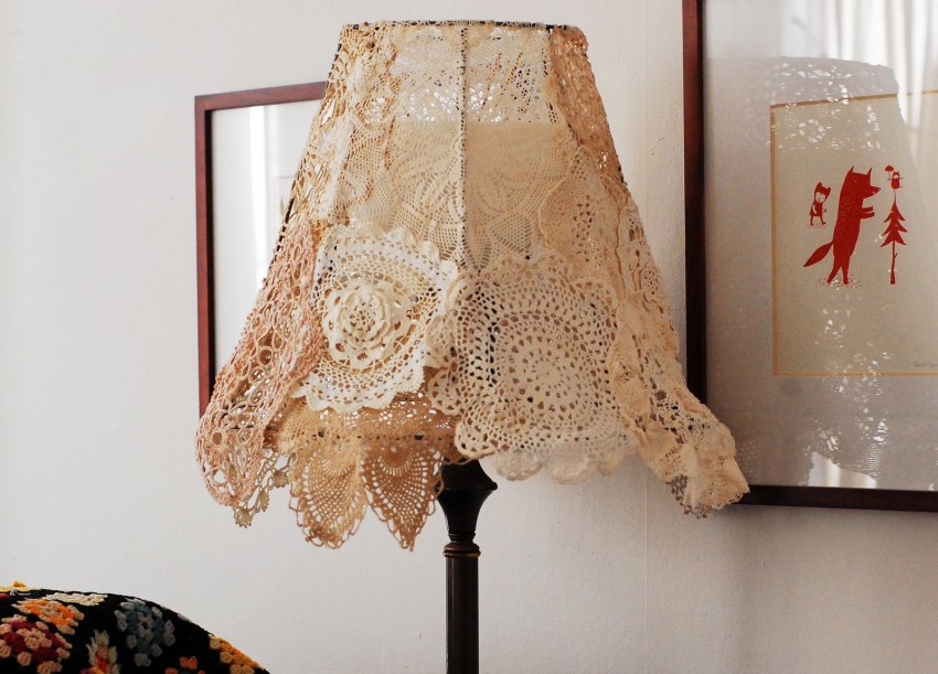 Можно старый абажур настольного светильника просто обтянуть кружевом и задекорировать лентами