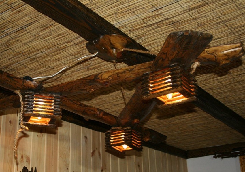 - Деревянные плашки применяют для обшивки основы плафона. Это могут быть дощечки, рейки, веточки.