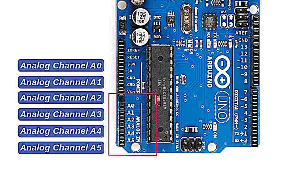 Arduino Uno offers six analog channels. The header on the left side of the board has all these analog pins together. This diagram shows the Pinout location of the analog pins.