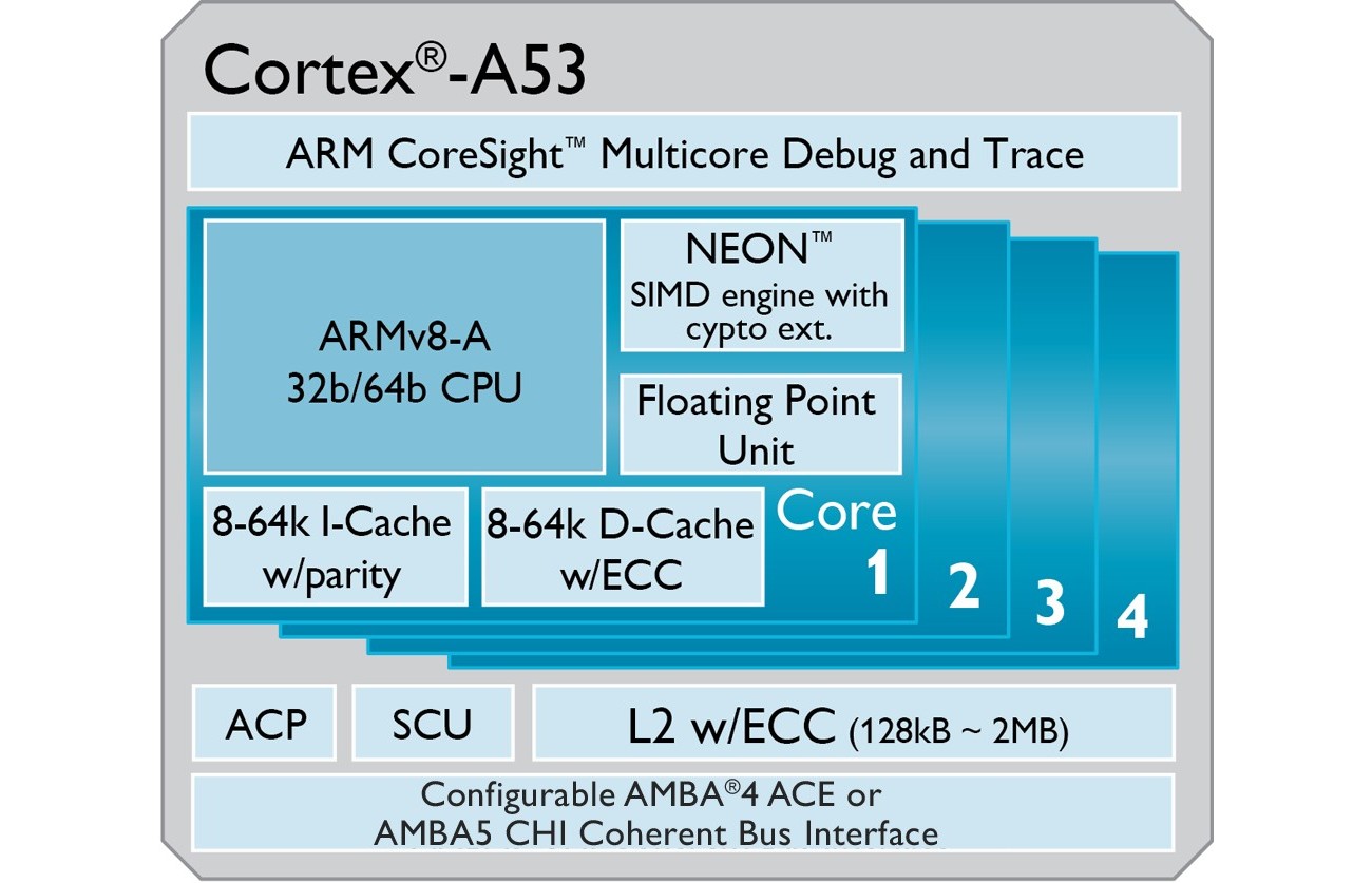 Первыми процессорными ядрами ARMv8, разработанными непосредственно компанией ARM Limited, стали Cortex-A53 и A57. Ядро A53 является среднеуровневым решением с производительностью 2,3 DMIPS/МГц, что находится примерно по середине между нынешними Cortex-A7 (1,9 DMIPS/МГц) и A9 (2,5 DMIPS/МГц). Тогда как A57 занимает верхний сегмент, ведь его быстродействие (4,1 DMIPS/МГц) превосходит показатели обеих 32-битных флагманов: Cortex-A15 (3,5 DMIPS/МГц) и А17 (4 DMIPS/МГц).