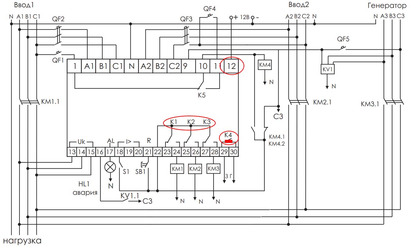 А как будет запускаться генератор, если исчезнет питание с обоих вводов? Контакт №12 служит для подключения к АВР внешнего источника питания +12В.