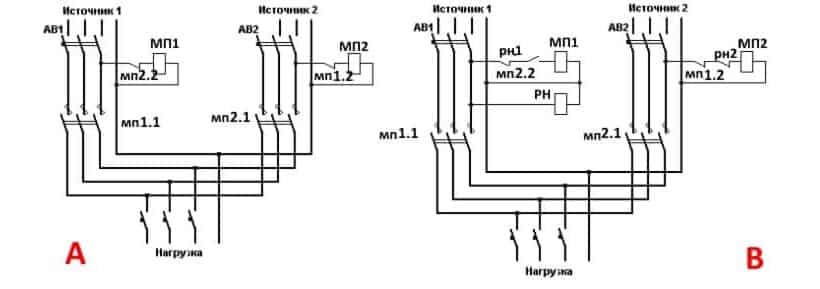 Для каждого источника питания берется по одному магнитному пускателю, силовые контакты которых рассчитаны на штатное значение силы тока и напряжения в сети потребителя электрической энергии. Входная группа каждого подключается к своему источнику питания – одна к линии электропередач, другая к выходу резервного генератора переменного тока, вращаемого дизельным или бензиновым ДВС. Выходные группы силовых контактов объединяются по принципу фаза к фазе.