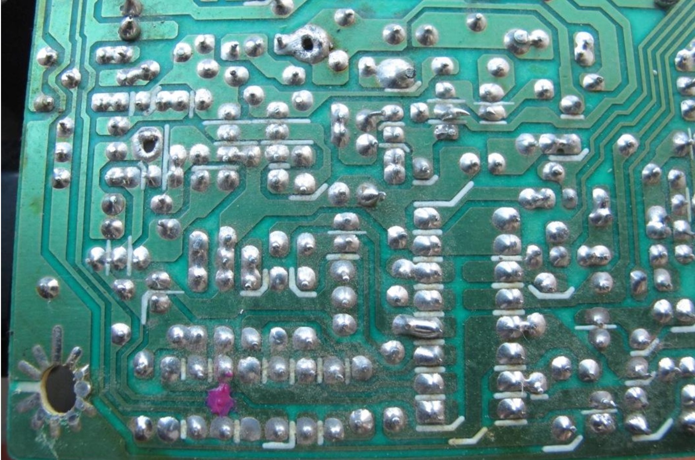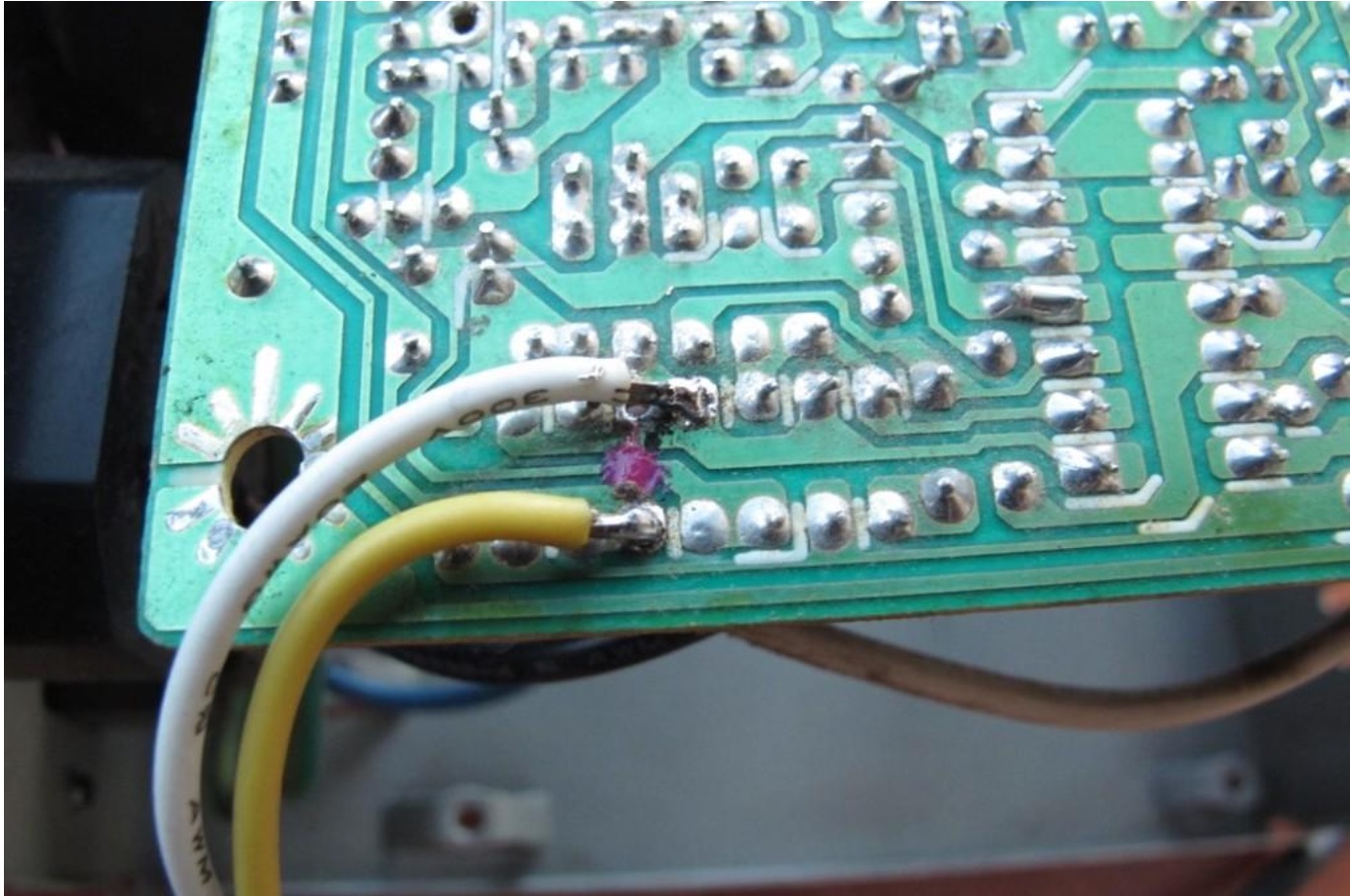 - Провода, присоединённые к плате, отпаяйте. Но зелёный оставьте и припаяйте к «минусу» (это токоведущие площадки, ранее бывшие с проводками тёмного цвета). Такая операция позволит запустить блок.