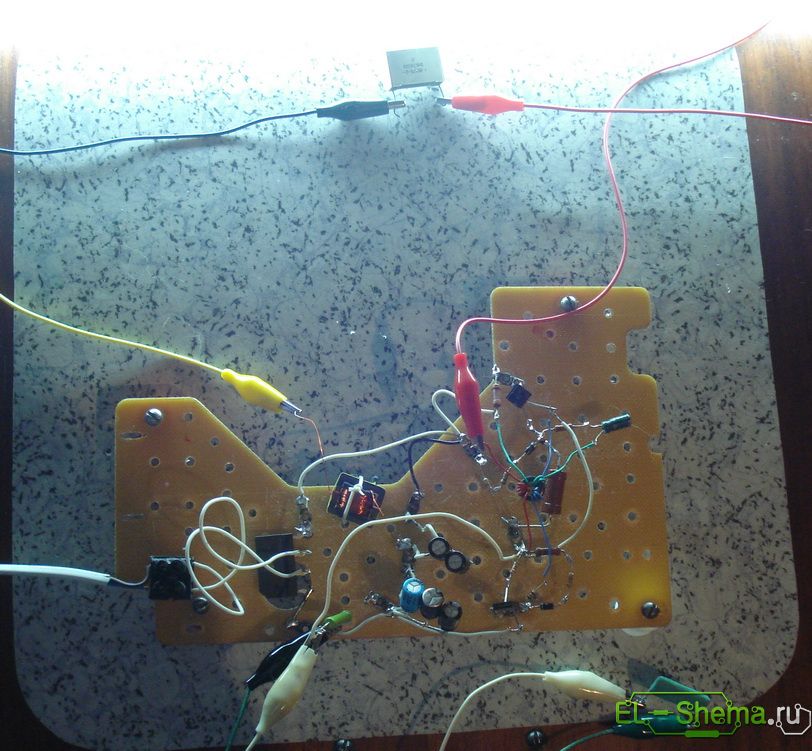 Первая сборка на монтажной плате. Номиналы компонентов подбирал скрупулёзно, невзирая на габариты и количество, и был вознаграждён — лампочка зажглась с первого раза. Ферритовое кольцо (10 х 6 х 4,5 мм) от энергосберегающей лампочки, его магнитная проницаемость неизвестна, диаметр провода катушек на него намотанных 0,3 мм (без изоляции). Первый пуск в обязательнейшем порядке через лампочку накаливания в 25 Вт. Если она горит а люминесцентная первоначально мигает и тухнет — увеличивайте (постепенно) номинал С4, когда всё заработало и ничего подозрительного обнаружено не было, и убрал лампу накаливания, то уменьшил его номинал до первоначального значения.