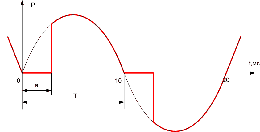 Точно также как и тиристорный регулятор симисторный регулятор мощности осуществляет регулировку за счет изменения угла открывания. Чем больше угол ‘a’ тем меньше энергии попадает на выход устройства.