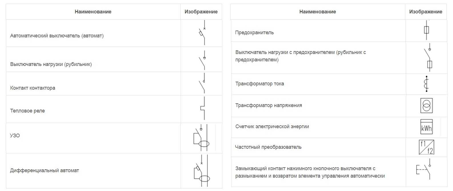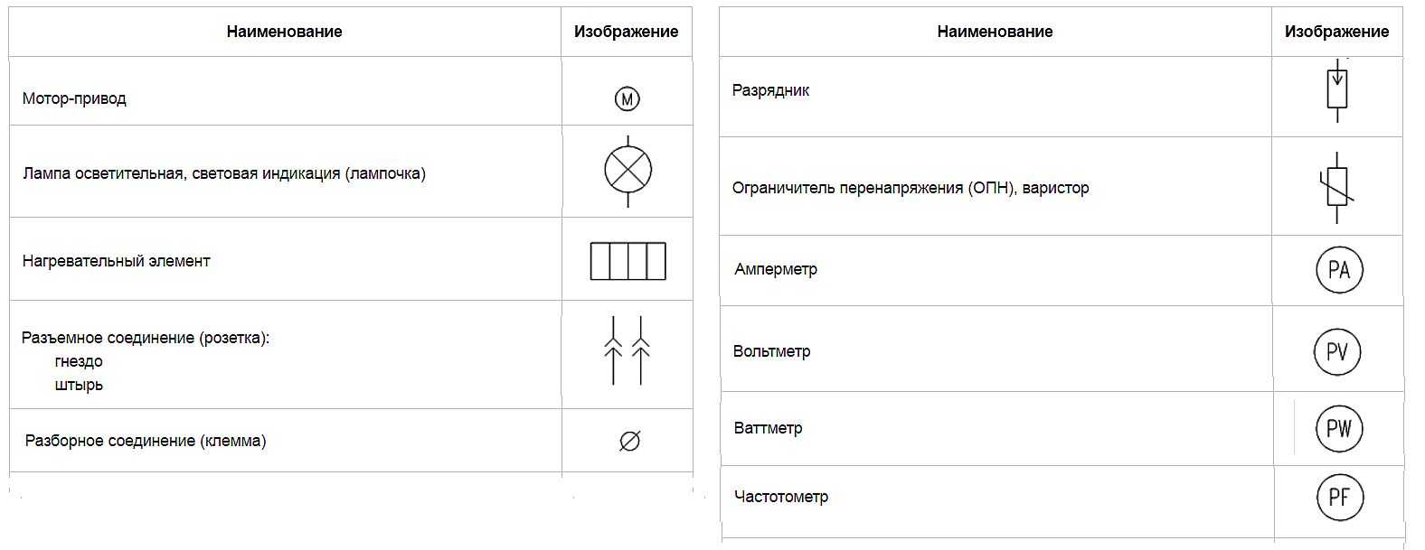 Это может быть освещение или изменение напряжения. Следующие таблицы содержат основные обозначения для такого типа электроэлементов.