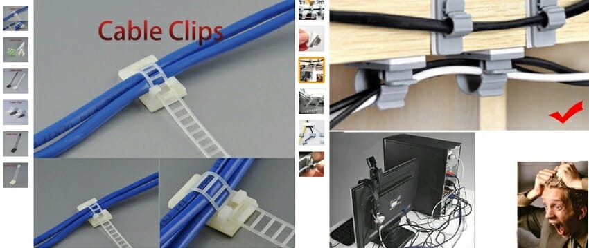 Закрепить и спрятать провода от компьютера под столом и в районе рабочей поверхности можно и с помощью обычных кабель-каналов и пластиковых жгутиков, которые используют электромонтажники. Также что-то практичное можно присмотреть на алиэкспрессе. Кодовое название – «кабельный зажим». Ну и много других китайских вариаций.