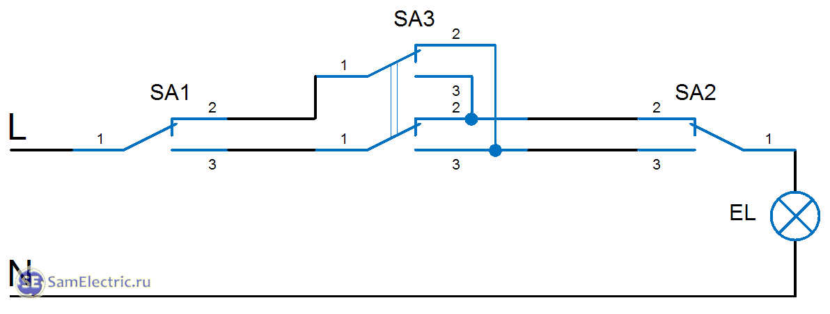 Схема с перекрестным переключателем для включения освещения с трёх мест