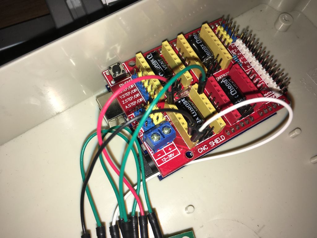 Поскольку я очень хорошо знаком с Arduino и хочу иметь полный контроль через USB, я сначала выбрал Arduino Uno со щитом GRBL и степперами TB8825. Эта конфигурация работает очень просто, и после небольшой настройки машина стала управляемой на ПК. Отлично!