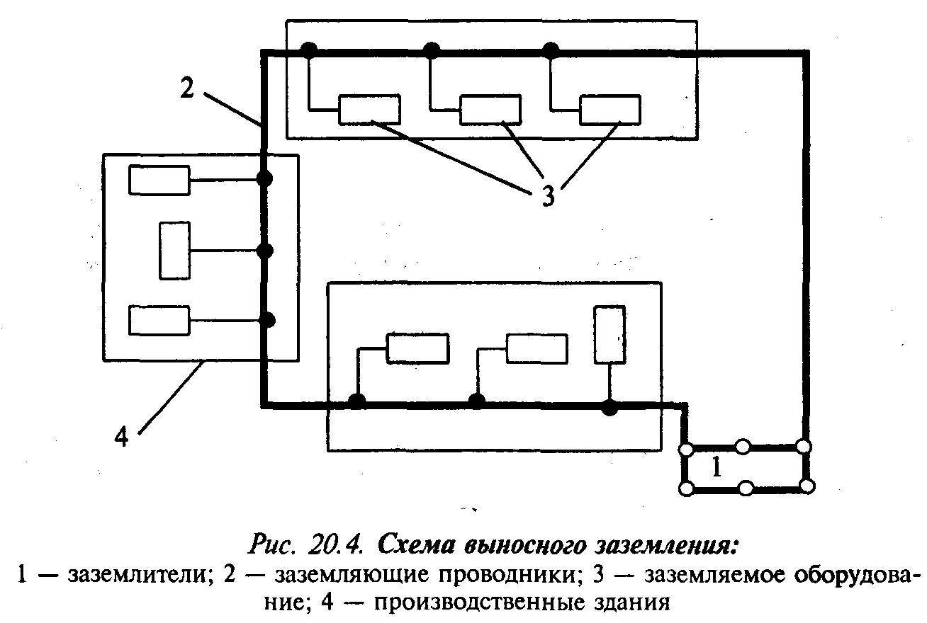 В зависимости от взаимного расположения заземлителей и заземляемого оборудования различают выносные и контурные заземляющие устройства. Первые из них характеризуются тем, что заземлители вынесены за пределы площадки, на которой размещено заземляемое оборудование, или сосредоточены на некоторой части этой площадки (рис. 20.4).