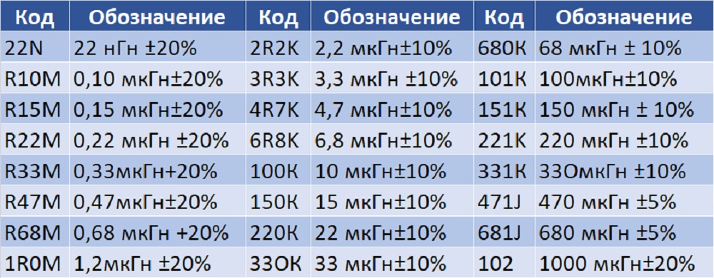 - первые две метки (полосы или точки) указывают на значение номинальной индуктивности в микрогенри (мкГн);