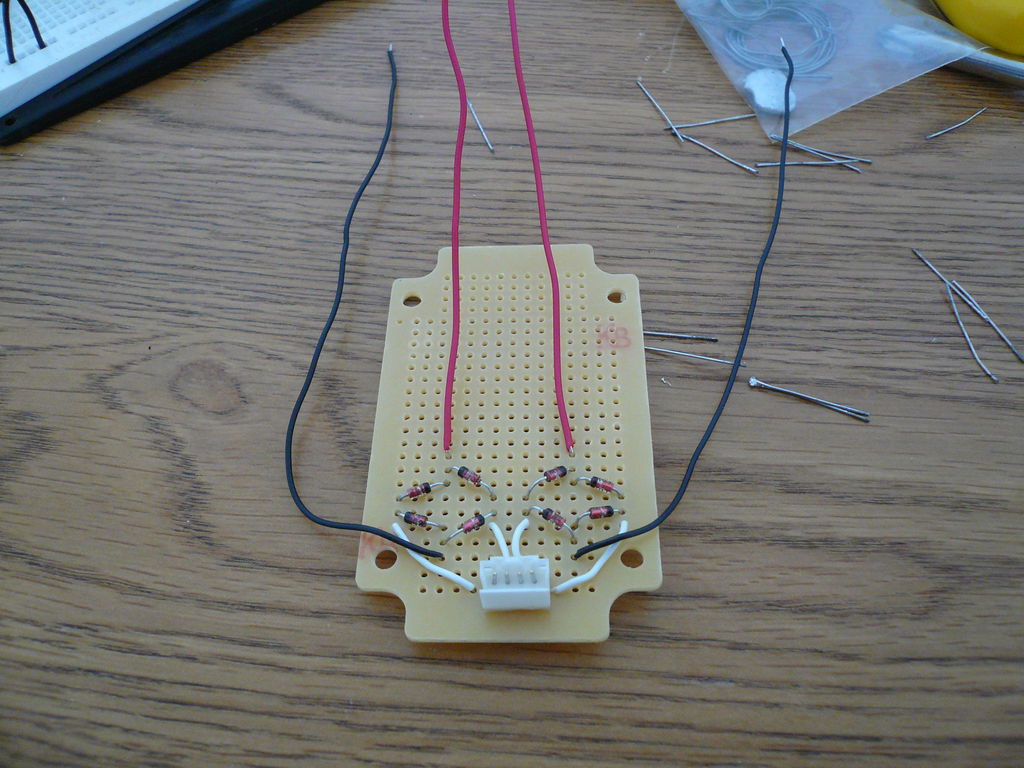 Давайте сделаем схему динамомашины для велосипеда. Неплохой идеей является проверить все перед тем, как спаять все вместе, поэтому сначала я собрал всю схему на макетной плате без припоя. Я начал с разъема двигателя и диодов. Я распаял разъем от печатной платы принтера. Размещение диодов в такой ориентации изменяет поступающий от двигателя переменный ток, на постоянный ток (выпрямляет его).