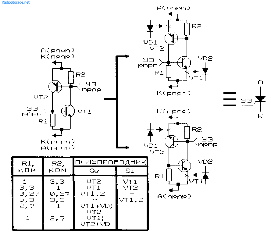 Необходимо лишь, чтобы подводимое к полупроводниковому прибору или его аналогу напряжение не превышало предельных паспортных значений. В таблице (рис. 2) показано, какими величинами R1 и R2 следует руководствоваться при создании аналога тиристора на основе германиевых или кремниевых транзисторов.