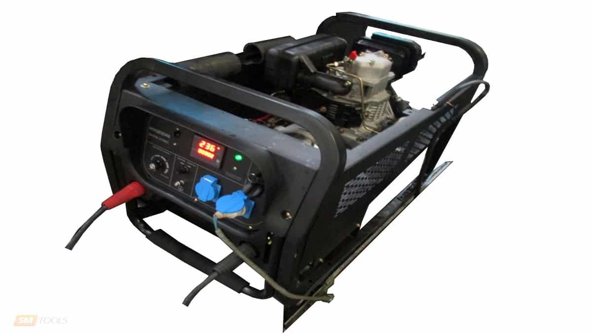 Особой разновидностью дизельных и бензиновых электростанций следует считать сварочные агрегаты, генерирующие постоянный или переменный ток для электродуговой сварки. Выходное электрическое напряжение относительно низкое (около 90 вольт), однако сила тока велика, электрические генераторы не боятся коротких замыканий.