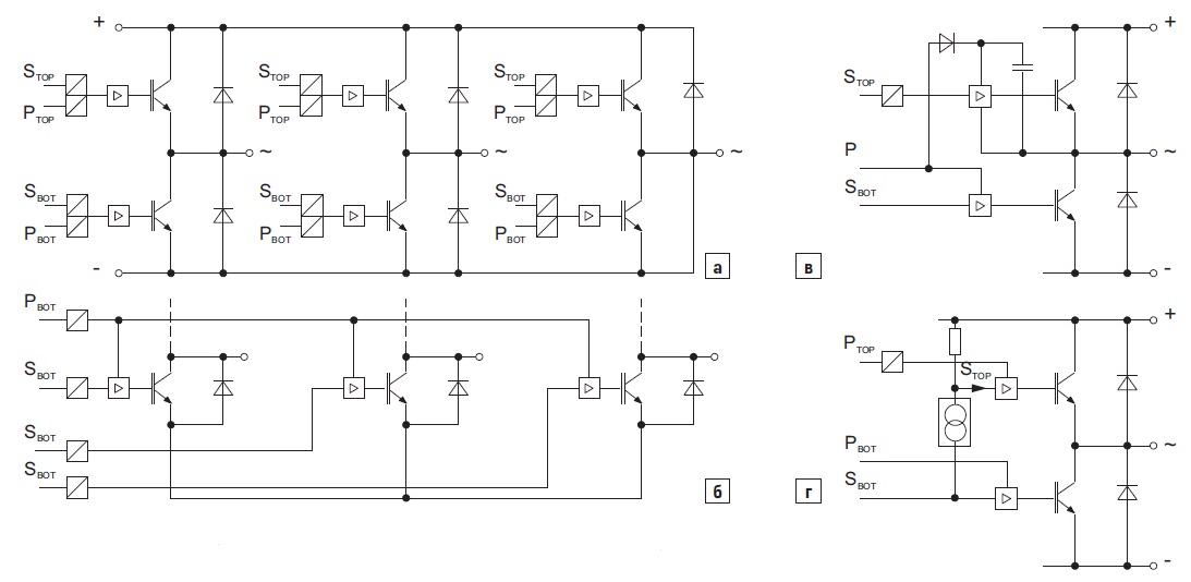 На рис. 13 показаны базовые схемы передачи сигналов управления. Самая сложная конфигурация, используемая в преобразователях высокой мощности (рис. 13а), обеспечивает потенциальную развязку импульсов S и энергии управления Р по каждому каналу. Такая топология является наиболее предпочтительной, она отличается высокой помехозащищенностью и минимальным уровнем взаимного влияния ключей.