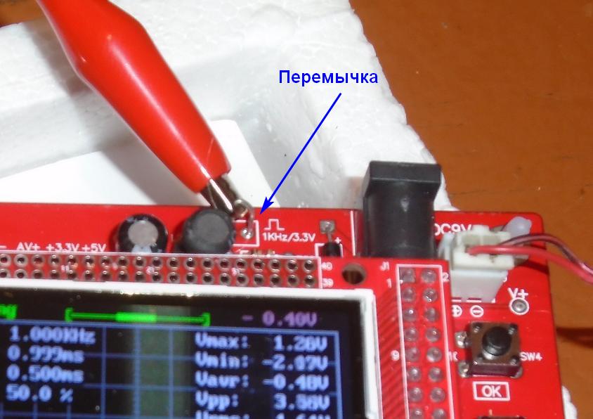 находится рядом с разъёмами питания. Внутренний генератор выдаёт прямоугольные импульсы частотой 1 кГц и амплитудой