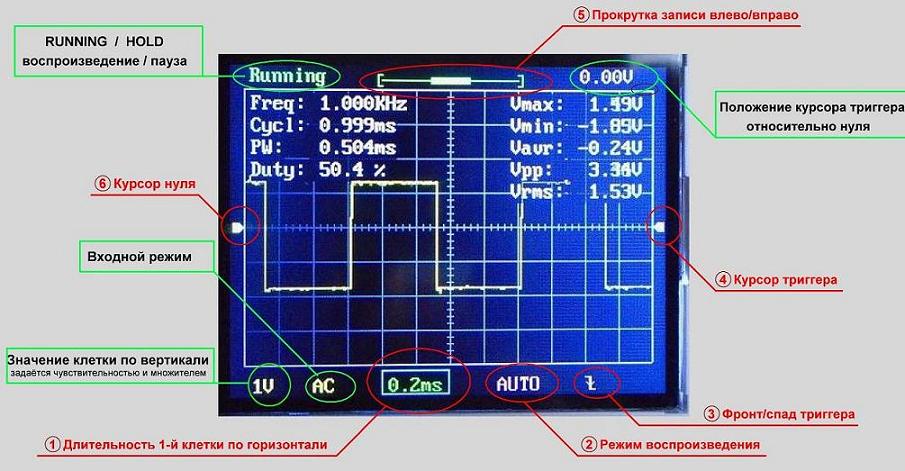 Справа от экрана расположено 4 кнопки (1 снизу не в счёт — это перезагрузка): пауза/пуск — позволяет остановить меняющуюся картинку и рассмотреть более подробно, выбор параметра — позволяет выбрать один из нескольких параметров и кнопками +\- подкорректировать. Выбираемые параметры (по хронологии нажатий): ❶ Длительность одной клетки по горизонтали, по факту настраивается под нужную частоту; ❷ Режим воспроизведения, не заметил особой разницы между тремя режимами, только незначительные нюансы, режим «AUTO» самый удобный; ❸ Срабатывание триггера, по фронту или спаду сигнала. Я толком не разобрался в этой функции, это связано с наладкой устройств с цифровым, логическим сигналом; ❹ Курсор триггера, можно выставить нужную величину напряжения для срабатывания. При достижении кривой сигнала выставленного значения срабатывает светодиод под экраном. Кроме этого, когда курсор в пределах действующего сигнала, график более удобно рассматривать, он не плывёт. Для аналоговых измерений лучше выставлять его на нуль; ❺ Прокрутка картинки влево/вправо. Функция полезна при паузе — можно рассмотреть кривую сигнала большей длительности, чем позволяет экран; ❻ Курсор нуля, собственно его можно перемещать как вверх, так и вниз. Таким образом можно рассматривать положительные или отрицательные полуволны более подробно;