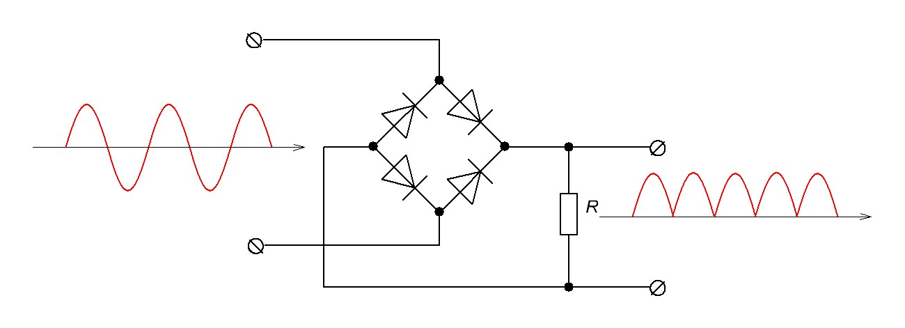 Обратите внимание, что независимо от полярности напряжения на входе, полярность на нагрузке постоянная, а ток в нагрузке течет в одном направлении. Таким образом, схема преобразует входное переменное напряжение в пульсирующее постоянное напряжение