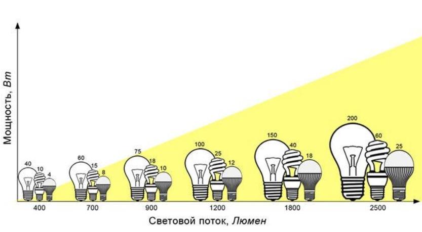 Чем выше мощность лампы – тем больше световой поток, это правило действует для всех видов.
