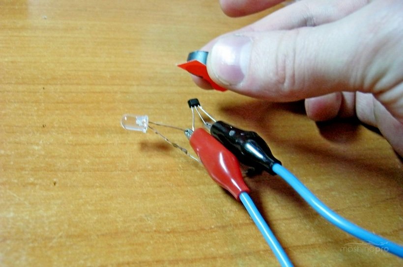 сделанный для измерения прибор подсоединяем к тем же клеммам. Светодиод обязательно