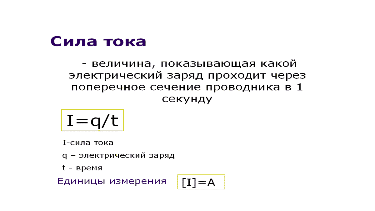 Таким образом, если известен электрический заряд, прошедший через проводник за определенное время, то не трудно найти величину этого заряда прошедшего за единицу времени, то есть: I = q/t