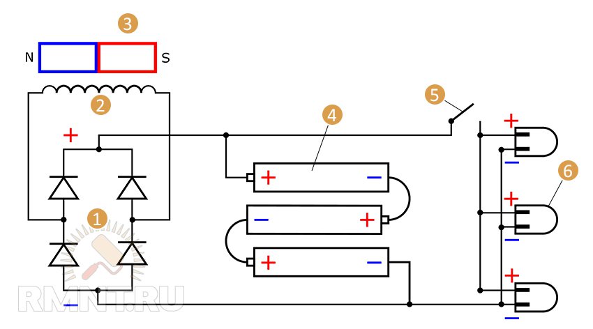 1 — диодный мост; 2 — катушка; 3 — магнит; 4 — батарейки 3х1,2 В; 5 — выключатель; 6 — светодиоды