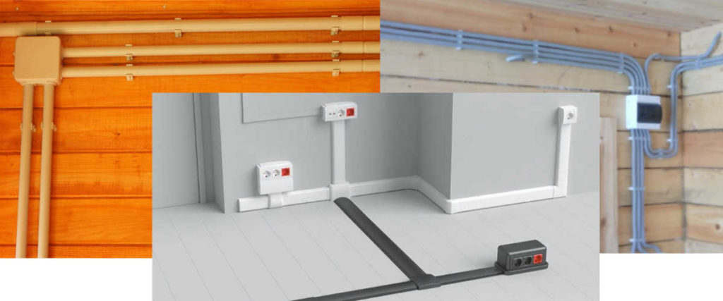 Прокладка кабелей внутри горючих стен связана со сложностями: требования очень жесткие. Их можно выполнить в каркасных или панельных домах, но в брусовых или в срубах очень сложно. Необходимо в стены укладывать цельнометаллические лотки. При этом приходится вынимать большое количество древесины, что не улучшает теплотехнические характеристики да и внешний вид сделать идеальным не представляется возможным. Потому в деревянных домах чаще прибегают к открытому способу монтажа — поверх стен.