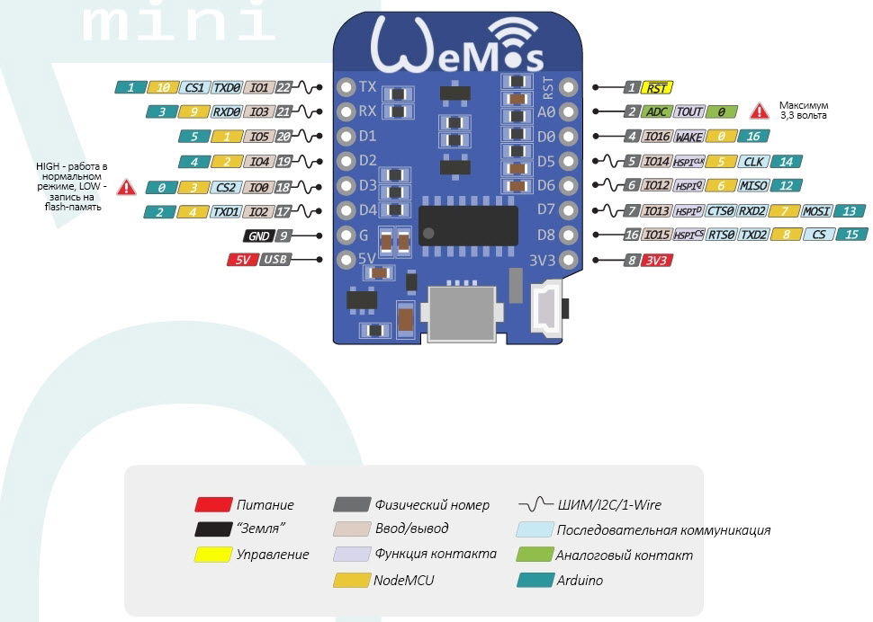 Кроме того, у него меньше контактов, чем у плат NodeMCU (подробнее смотрите в распиновке на картинке ниже) – из-за укороченной длины. С другой стороны, у D1 mini есть контакт для 5 вольт (как у LoLin V3).