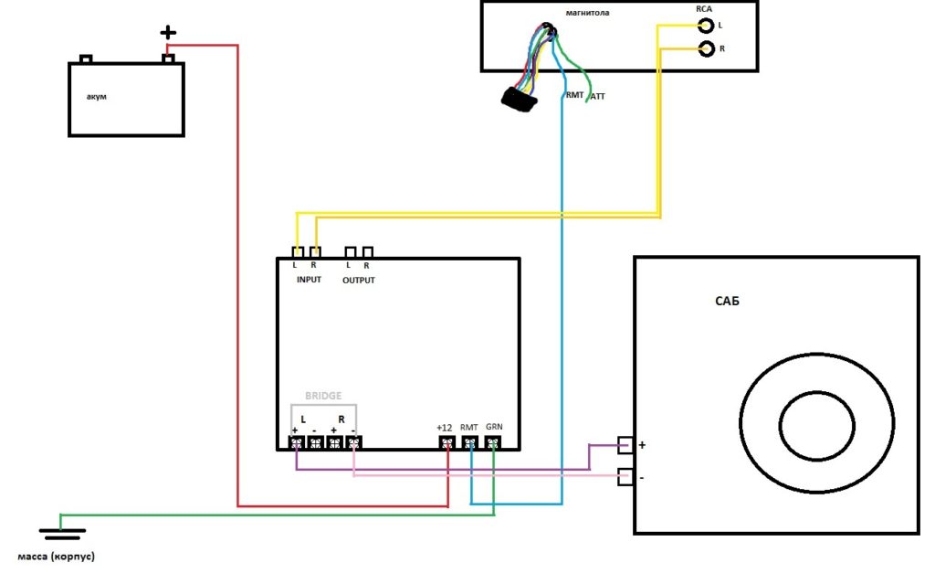 Сабвуфер можно подключить самостоятельно, опираясь на параметры данной схемы