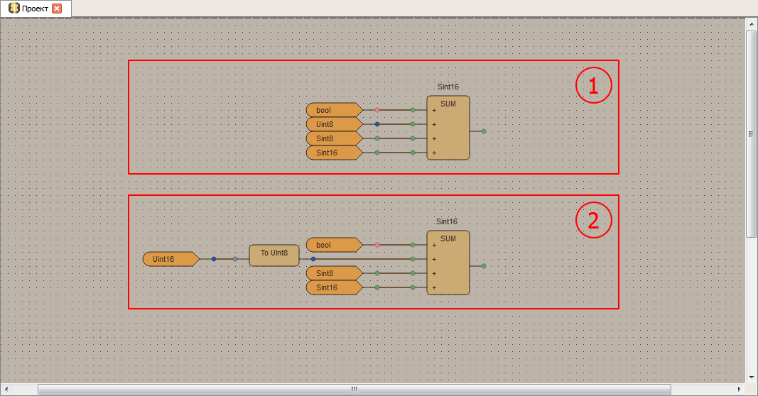 zetFBD преследует цель достижения однозначности поведения устройства при любых входных данных. Для определенности значений входов, связанных с выходами, имеющими отличный тип данных, имеется требование: тип данных выхода должен быть подмножеством типа данных входа. Если для какой-либо связи это требование является ненужным или недостижимым – пользователь должен вставить блок «Преобразование данных» в разрыв этой связи. Вход этого блока принимает данные любого типа. Опции этого блока позволяют определить его поведение при наличии значения, не попадающего во множество значений требуемого типа данных. Блоки, значения выходов у которых могут выходить за диапазон значений типа данных (переполнение при математических операциях), имеют опции, определяющие их поведение.