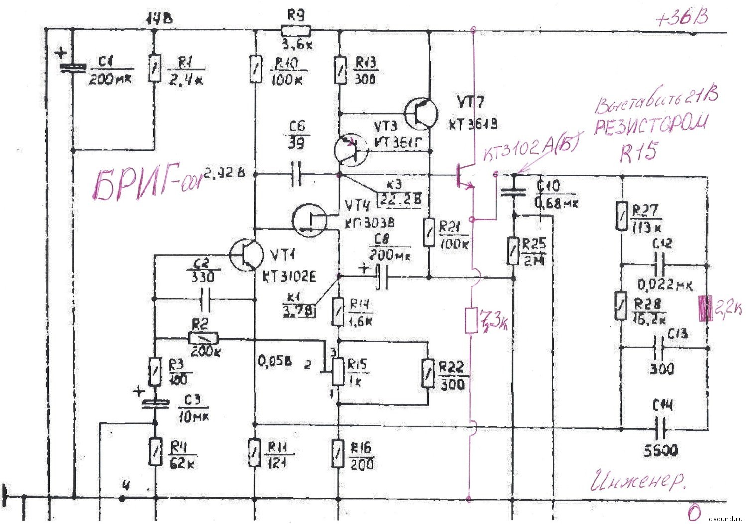 У Бриг-001 R27 = 113 кОм, R28 = 16,2 кОм = 16,2 кОм → 113/16,2 = 6,975 кОм.
