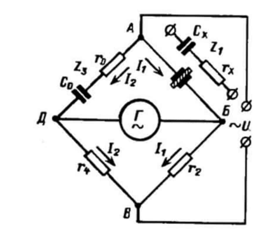 При измерении ёмкостей неполярных конденсаторов часто вместо RC-цепочки собирают мостовую схему с частотным генератором (показано на рис. 5), а также другие сборки. Сопротивления резисторов подбирают в зависимости от параметров номинальных напряжений измеряемых деталей. Ёмкость вычисляют из соотношения: r4 / Cx = r2 / C0.