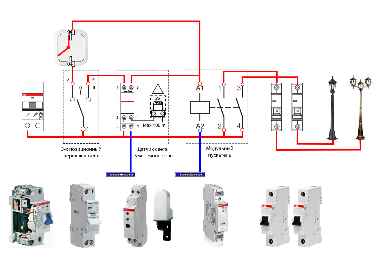 Общая схема подключения и управления уличным освещением от фотореле с применением пускателя, будет выглядеть следующим образом:
