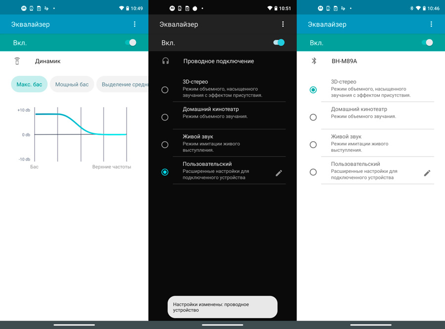 Для этого динамика можно воспользоваться эквалайзером с пятью пресетами, акцентирующих на выбор — басы, средние, или высокие частоты, а также голос. При подключении проводных наушников, которых в комплекте со смартфоном нет, меню эквалайзера расширяется, в том числе, за счет добавления режимов 3D-стерео, домашнего кинотеатра и живого звука. Такие же опции доступны и для сопряжённой со смартфоном Bluetooth-гарнитуры.