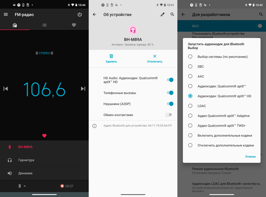 Приложение «FM-радио» умеет записывать стерео-трансляции в формате AAC (44,1 кГц, 2 канала). В качестве коротковолновой антенны для него необходимы проводные наушники, а вот слушать вещание можно через динамик смартфона или даже на подключенном Bluetooth-аксессуаре. Для передачи качественного звука на беспроводные «уши», помимо AAC и LDAC, заготовили полный набор кодеков aptX.