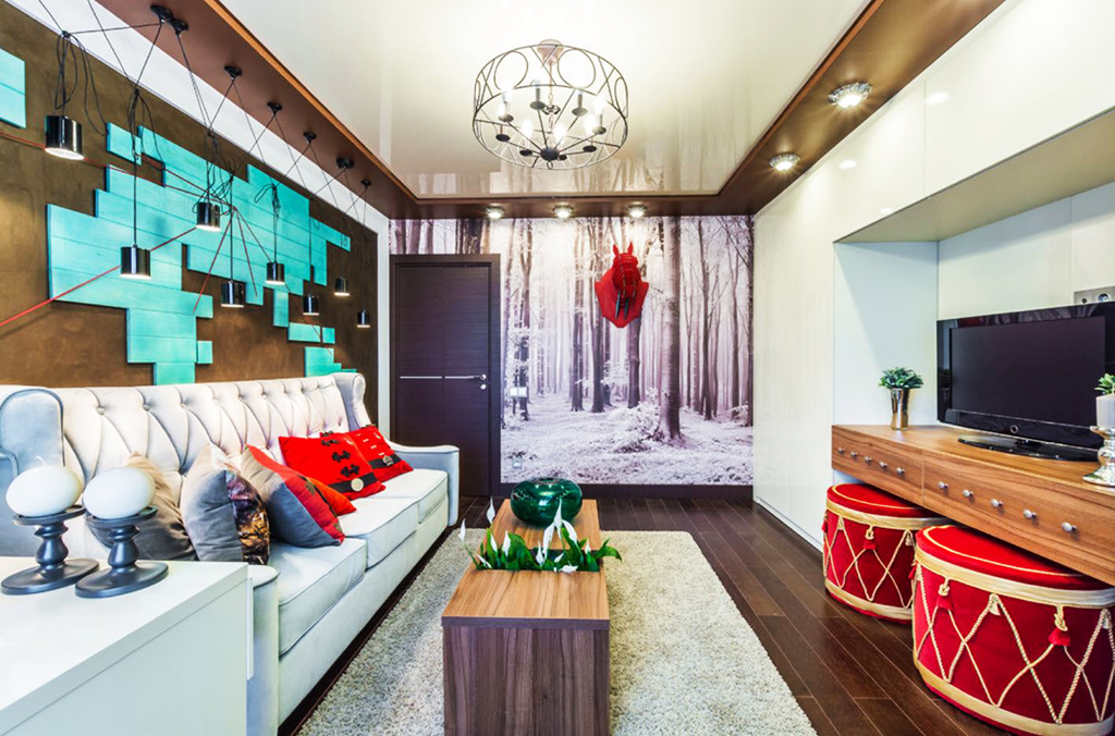 Кроме того в зале по вечерам собирается вся семья, активно отдыхает, смотрит телевизионные передачи или же устраивается поудобнее за просмотром фильма на домашнем кинотеатре. Уже исходя из этого, можно сделать логичный как гром после молнии вывод: игнорировать потолок как один из самых эффективных инструментов выразительности нельзя ни в коем случае.