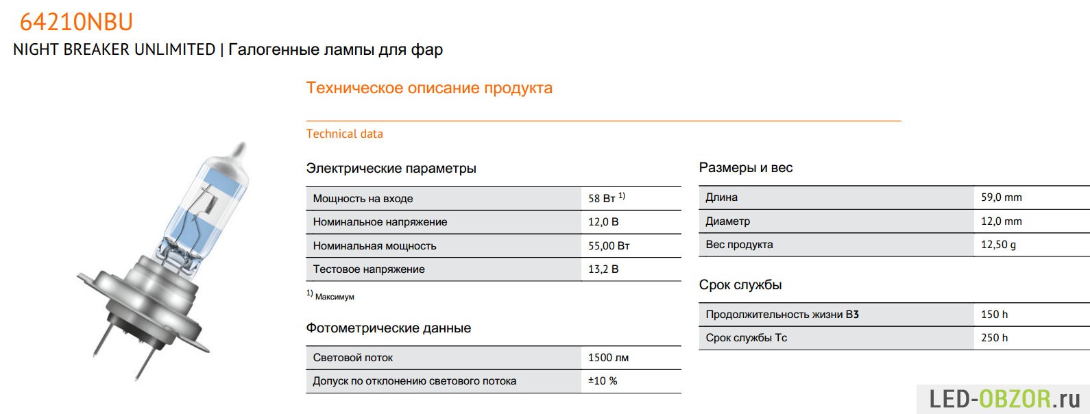 Технические характеристики Osram Night Breaker Unlimited ничем не отличаются от параметров обычной галогеновой лампы H7. Некоторые изменения конечно есть, но не 110% а 10%.