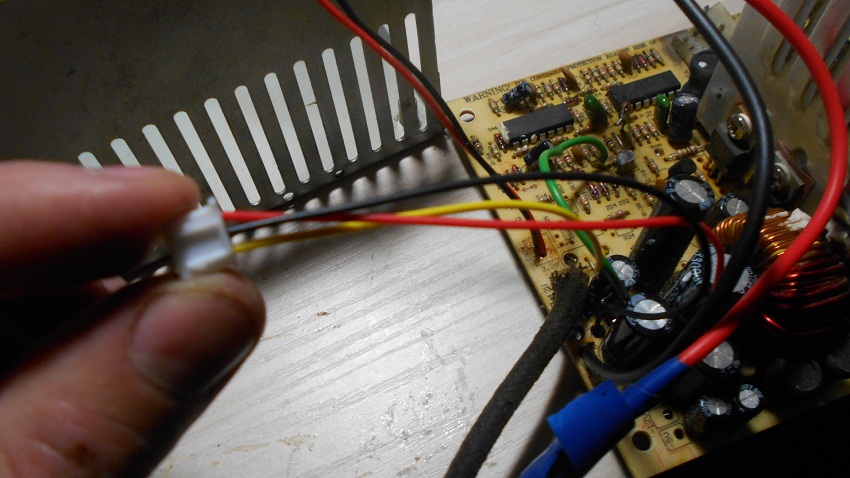 Также выпаиваем сглаживающие электролитические конденсаторы по всем линиям питания. На схеме они обозначены как С30, С27, С29, С28, С35. Мы собираемся существенно (до 25 В по шине +12 В) поднять выходное напряжение, на которое эти конденсаторы не рассчитаны. На место того, что стоял по шине +12 В, устанавливаем конденсатор той же или большей емкости на напряжение не менее 35 В. Остальные места оставляем пустыми. Зеленый провод припаиваем на место, где был любой черный, чтобы разрешить блоку питания запускаться. Теперь можно заняться доработкой контроллера.