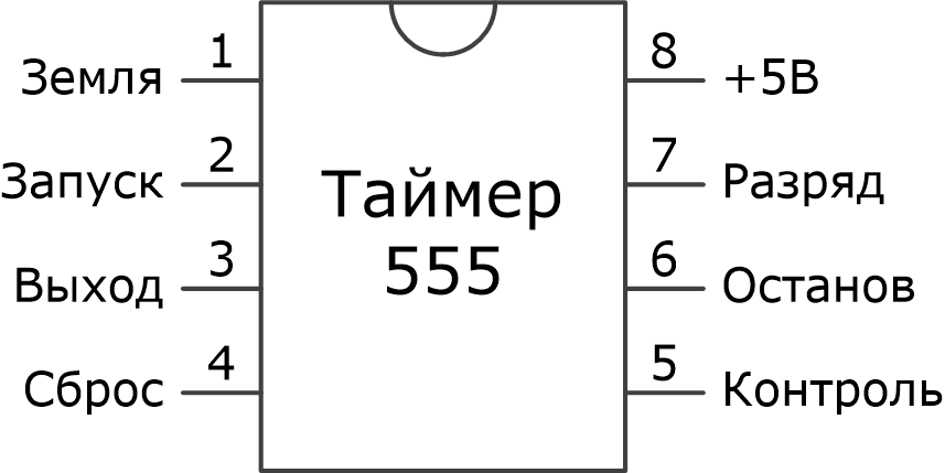. Вывод, который во всех схемах нужно подключать к минусу питания. 2.Триггер , он же запуск. Если напряжение на пуске падает ниже 1/3 Vпит, то таймер запускается. Ток, потребляемый входом, не превышает 500нА. 3.Выход . Напряжение выхода примерно на 1,7 В ниже напряжения питания, когда он включен. Максимальная нагрузка, которую может выдержать выход — 200 мА. 4.Сброс . Если подать на него низкий уровень напряжения (меньше 0,7 В), то схема переходит в исходное состояние не зависимо от того, в каком режиме находится таймер на данный момент. Если в схеме не нужен сброс, то рекомендуется подключить этот вывод к плюсу питания. 5.Контроль . Этот вывод позволит нам получить доступ к опорному напряжению компаратора №1. Используется этот вывод очень редко, а вися в воздухе может сбивать работу, поэтому в схеме его лучше всего присоединить к земле. 6.Порог , он же стоп. Если напряжение на этом выходе выше 2/3 Vcc, то таймер останавливается и выход переводится в состояние покоя. Стоит заметить, что работает выход только тогда, когда вход выключен. 7.Разряд . Этот выход соединяется с землей внутри самой микросхемы, когда на выходе микросхемы низкий уровень и закрыт, когда на выходе высокий уровень. Может пропускать до 200 мА и иногда используется как дополнительный выход. 8.Питание . Данный выход нужно подключать к плюсу питания. Микросхема поддерживает напряжение в пределах 4,5-16 В. Может работать от обычной 9В-батарейки или от проводка USB.