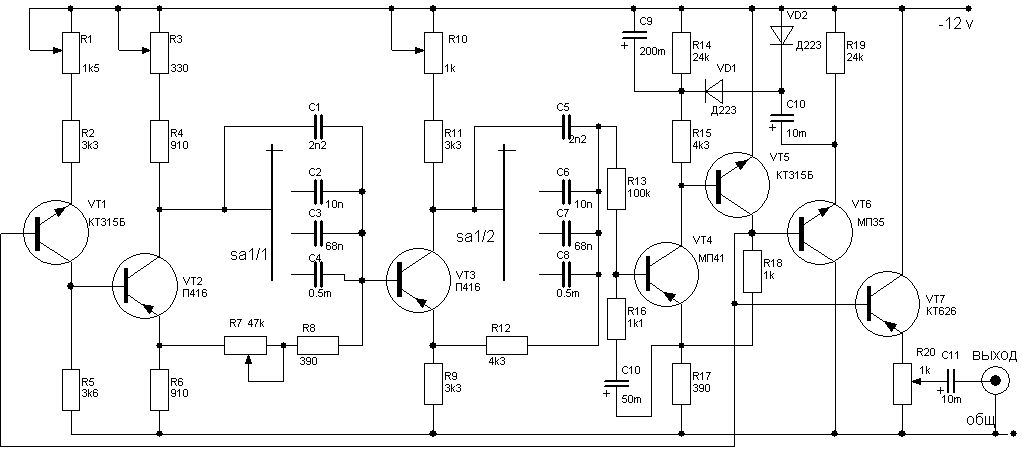 подстроечными резисторами R3 и R9 добиваемся получения минимальных искажений.