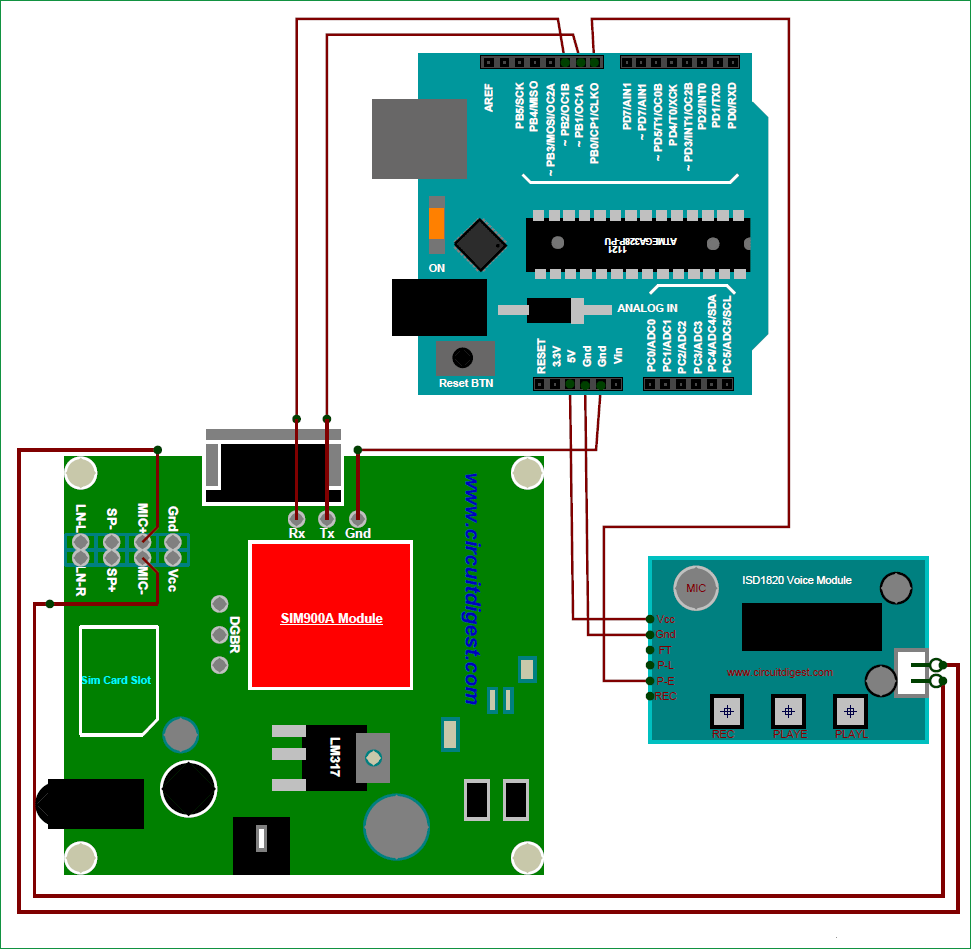 Как вы можете видеть, мы подали питание на GSM модуль с помощью адаптера на 12V 1A, а на плату Arduino мы подали питание с помощью батарейки 9V, голосовой модуль ISD 1820 запитывается от платы Arduino. Записанный голос с данного модуля (с его контактов динамика) мы можем непосредственно передавать на контакты микрофона GSM модуля.