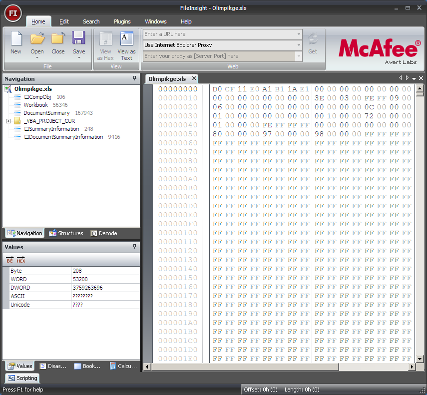 Для еще большего удобства работает система удобных закладок. При этом FlexHex непрерывно ведет историю всех операций – можно отменить любое действие, просто выбрав его из списка изменений (undo-list не ограничен)! В FlexHex поддерживаются все необходимые операции с бинарными данными, поиск ASCII и Unicode-строк. Если необходимо обрабатывать структуру с заранее известным форматом, задать ее параметры не составит труда с помощью специальных инструментов. В результате получаем отличный hex-редактор, но все-таки сильно уступающий тому же FileInsight. Единственная примечательная опция – это обработка OLE-файлов, но и тут есть проблемы. Несколько раз при попытке открыть зараженный OLE, программа вылетала с ошибкой «The docfile has been corrupted».