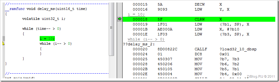 Нам нужен бесконечный цикл. Помещаем наши строчки PORTC = 0; __delay_cycles(4000000); PORTC = 255; __delay_cycles(4000000);внутрь бесконечного цикла, и вот что в итоге должно получиться://первая прога на Си для AVR#include <ioavr.h>#include <intrinsics.h>int main(void){ DDRC = 255; while(1){ PORTC = 0; __delay_cycles(4000000); PORTC = 255; __delay_cycles(4000000); } return 0;} Если у вас другой результат – пройдитесь снова по тексту. Может, я что-то полохо объяснил, может, вы что-то плохо поняли. Кликаем Make на панели с кнопками (можно нажать F7). Если все сделано правильно, IAR откомпилирует и соберет проект, а внизу откроется окно Messages, в котором будет написано:…..Total number of errors: 0Total number of warnings: 1 Все прошло без ошибок, но компилер выдал warning — statement is unreachable. Ничего страшного – он просто сообщает нам, что функция main() никогда не возвратит значение. Просто у нас в программе бесконечный цикл и микроконтроллер при работе никогда не дойдет до строчки return 0. Ищем папку проекта на жестком диске. Там, в директории Release лежит файл прошивки led.hex. Грузим в микроконтроллер… Светодиод заморгал? Отлично. А теперь легко проверить правильно ли работает наша программа. Берем механические часы и смотрим, моргает ли светодиод в такт с секундной стрелкой. У меня моргает, а у вас?
