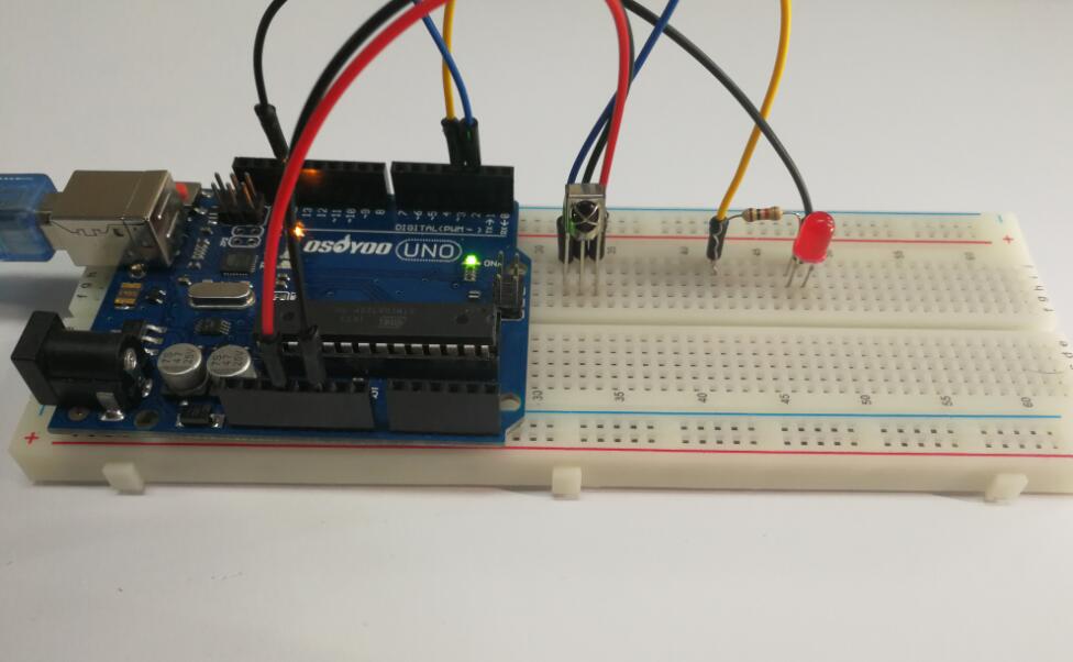Control a certain key (for example, Power key) via a remote controller by programming. When you press the key, infrared rays will be emitted from the remote control and received by the infrared receiver, and the LED on the Osoyoo Uno board will light up. Connect an LED to pin 3 on the Osoyoo Uno board so that you can see remotely whether the Power key is pressed down.
