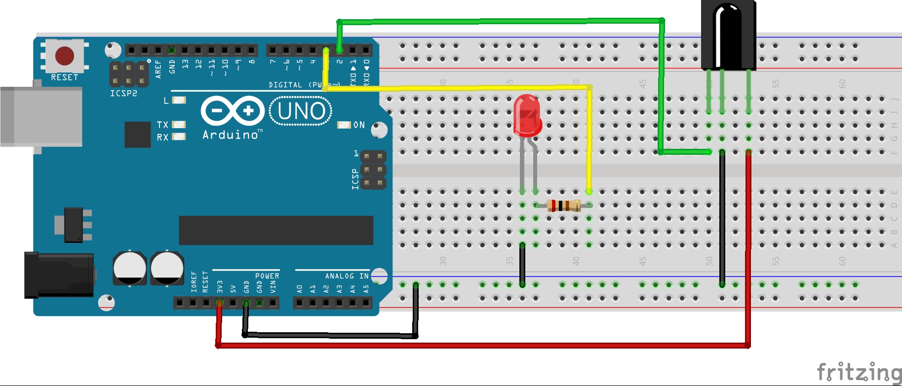 Корпуса инфракрасных приемников содержат оптический фильтр для защиты прибора от внешних электромагнитных полей, изготавливаются они специальной формы для фокусировки принимаемого излучения на фотодиоде. Для подключения IR приемника к Arduino UNO используют три ножки, которые соединяют с — GND, 5V и A0. Советуем для начала использовать 3,3 Вольта, чтобы не сжечь ИК датчик при настройке.