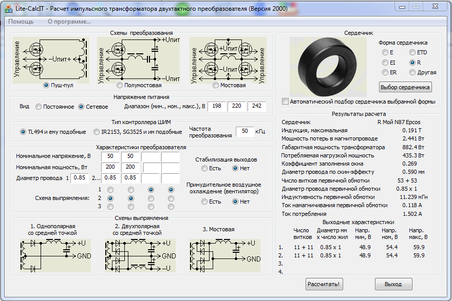 Популярностью пользуется программа Lite-CalcIT. Она может рассчитать трансформатор под имеющийся сердечник, а может подобрать оптимальный, исходя из введенных данных.