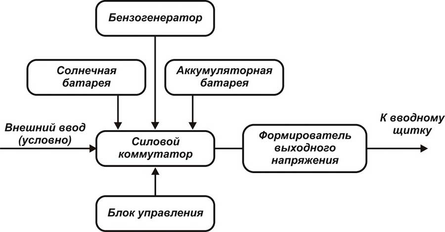Внешний ввод, солнечная и аккумуляторные батареи, а также бензогенератор в данном случае рассматриваются как взаимно дополняющие друг друга источники энергии и не могут функционировать параллельно.